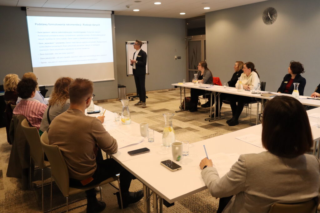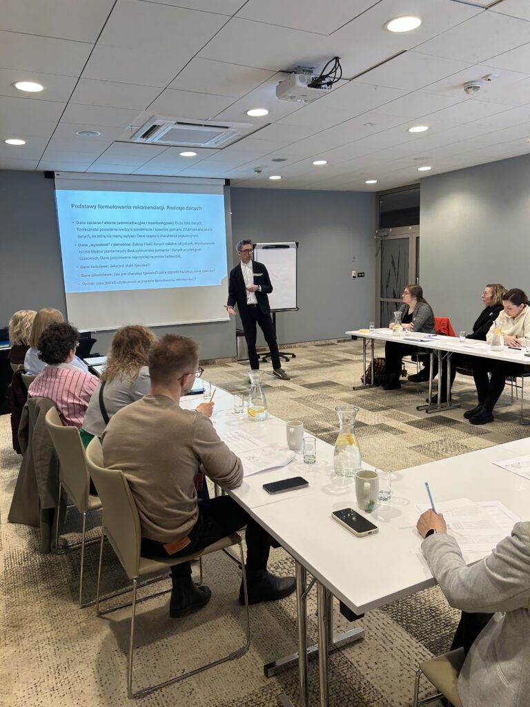Wraz z ostatnim wykładem rozpoczęły się warsztaty w grupach. Uczestniczki i uczestnicy mogli wraz z prowadzącymi zgłębić zagadnienia podstaw przygotowania dokumentów strategicznych i programowania w polityce społecznej (prowadzący dr Mateusz Rutkowski), tego jak poprawnie wyciągać wnioski z danych (prowadząca dr Małgorzata Ołdak), nauczyć się sposobów formułowania rekomendacji (prowadzący Michał Korczyński). Mocno lokalny wymiar miały trzy kolejne warsztaty: dr Magdalena Błaszczyk poprowadziła warsztat dotyczący tego jak szacować zapotrzebowanie na usługi społeczne dla osób w wieku senioralnym. Dr hab. Aneta Krzewińska, prof. UŁ, wskazywała na diagnozę partycypacyjną jako na metodę badań angażującą społeczność lokalną, a dr hab. Łukasz Łotocki, prof. UW, prezentował, jak pisać i mówić o lokalnej kondycji systemu pomocy społecznej.